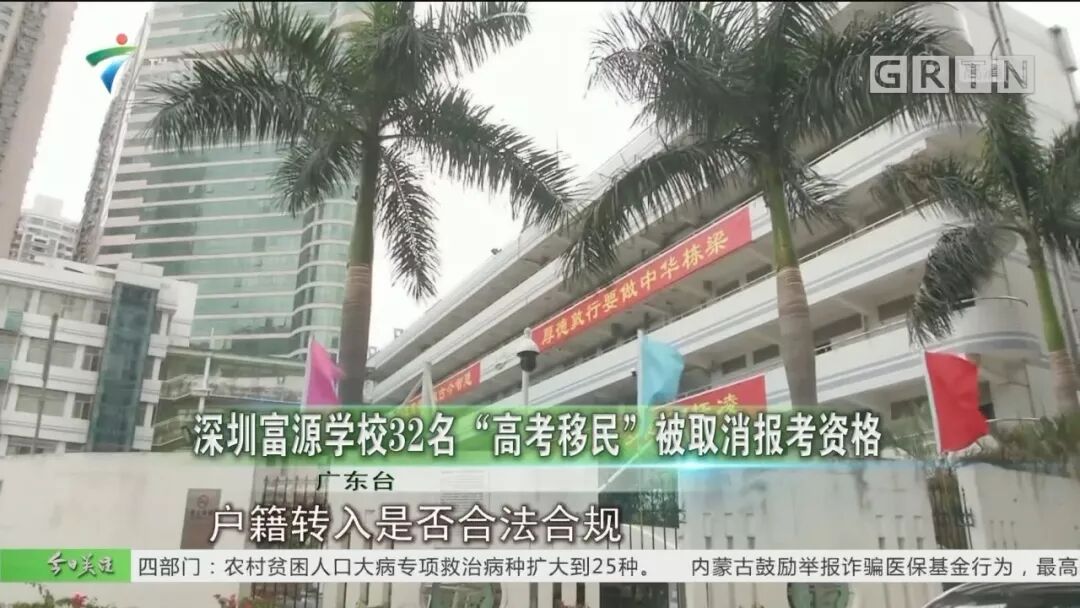 现查实,深圳市富源学校2019年高考报名考生中,有32名考生属“高考移民”,弄虚作假获取广东省报考资格。对上述32名考生,取消其在我市的高考报名资格,对深圳市富源学校予以行政处罚,核减该校2019年高中招生计划的50%。